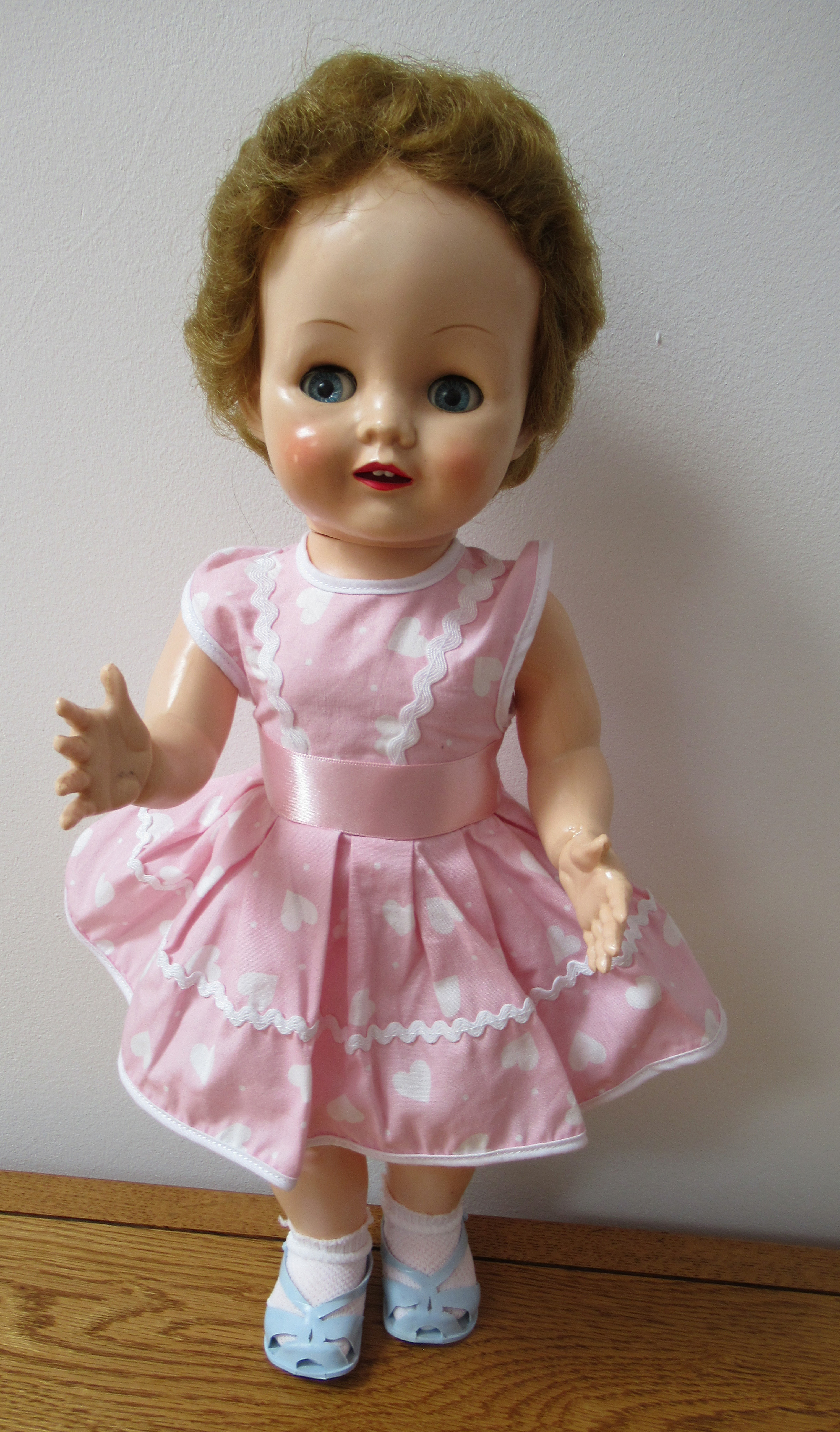 This is “Honey” a very lovely 16 inch hard plastic Blonde Walker doll from my own collection. She was made around 1955 by Pedigree. She is in very excellent condition – and has her original eyelashes on her blue sleeping eyes,  wonderful original  colour to her face, knees and backs of hands. . Her hair is shiny, full and has lots of curls she has not had much play and would have been sold undressed originally wearing only a nappy. I have made her a pretty Pedigree replica dress she also wears new/ vintage white nylon socks and vintage Cinderella Blue sandals. A happy little girl who will make you smile every time you look at her.