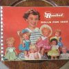 This is an original Hard Back Rosebud Dolls Catalogue from 1959 – it would have been given to shopkeepers at the time to show customers what Rosebud dolls were available. It is in good used condition but has worn corners front and back and the back page has some cello covering coming away at the bottom left and also this back page has been creased in the past, the front cover page has also signs of creasing from the past. The Shopkeeper who was “M A Rapport & Co of Bridge Street Cardiff ” had this stamped on the inside cover and they also wrote prices and sizes through the catalogue in Biro ( this was common  practice ). This being said it is a wonderful bright example which I am only selling because I have found another. A lovely addition to a collection of 1950’s dolls. Measures 11 inch x 8 1/4 and also includes Rosebud Vinyl and teen dolls, along with  squeaky toys.