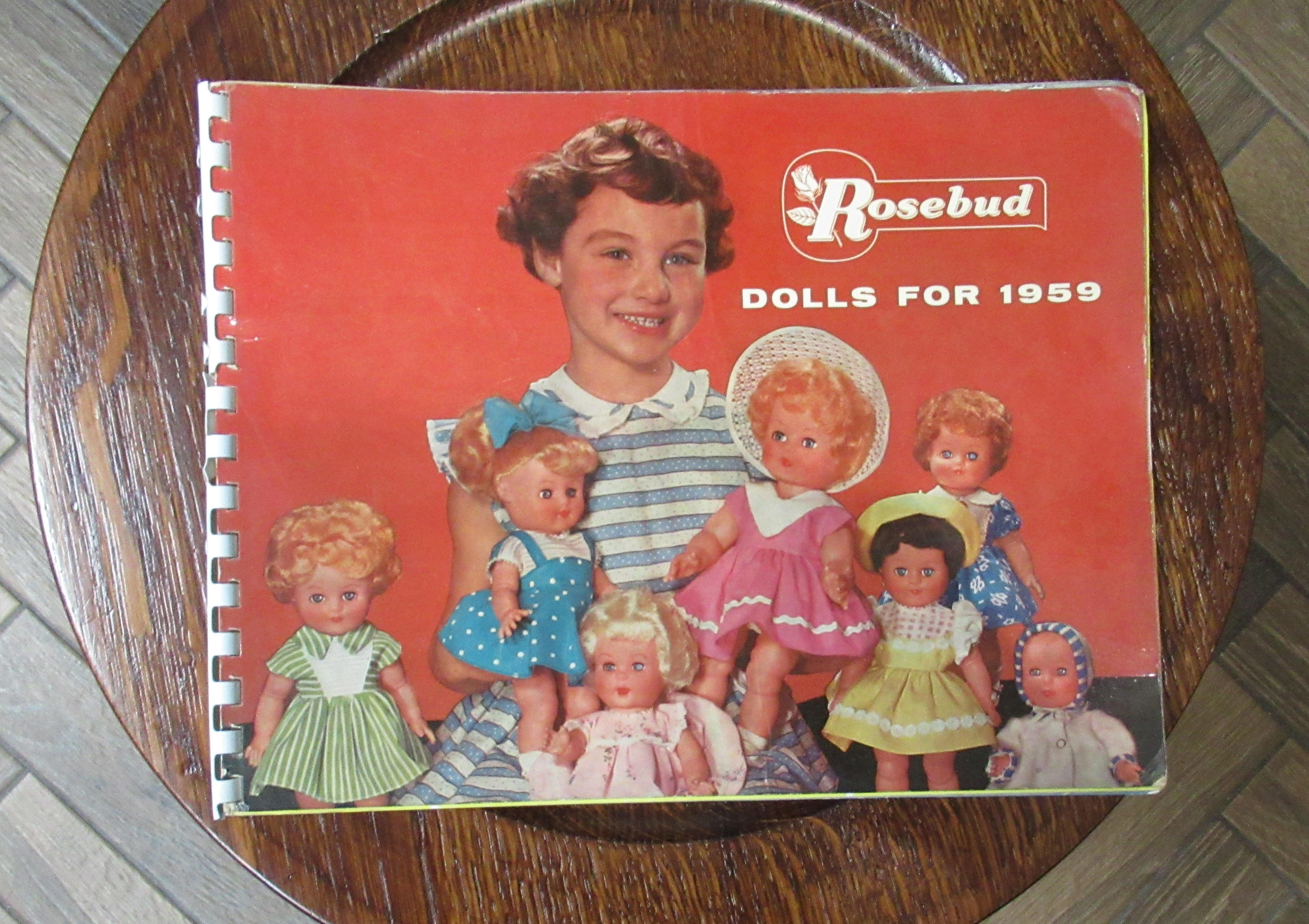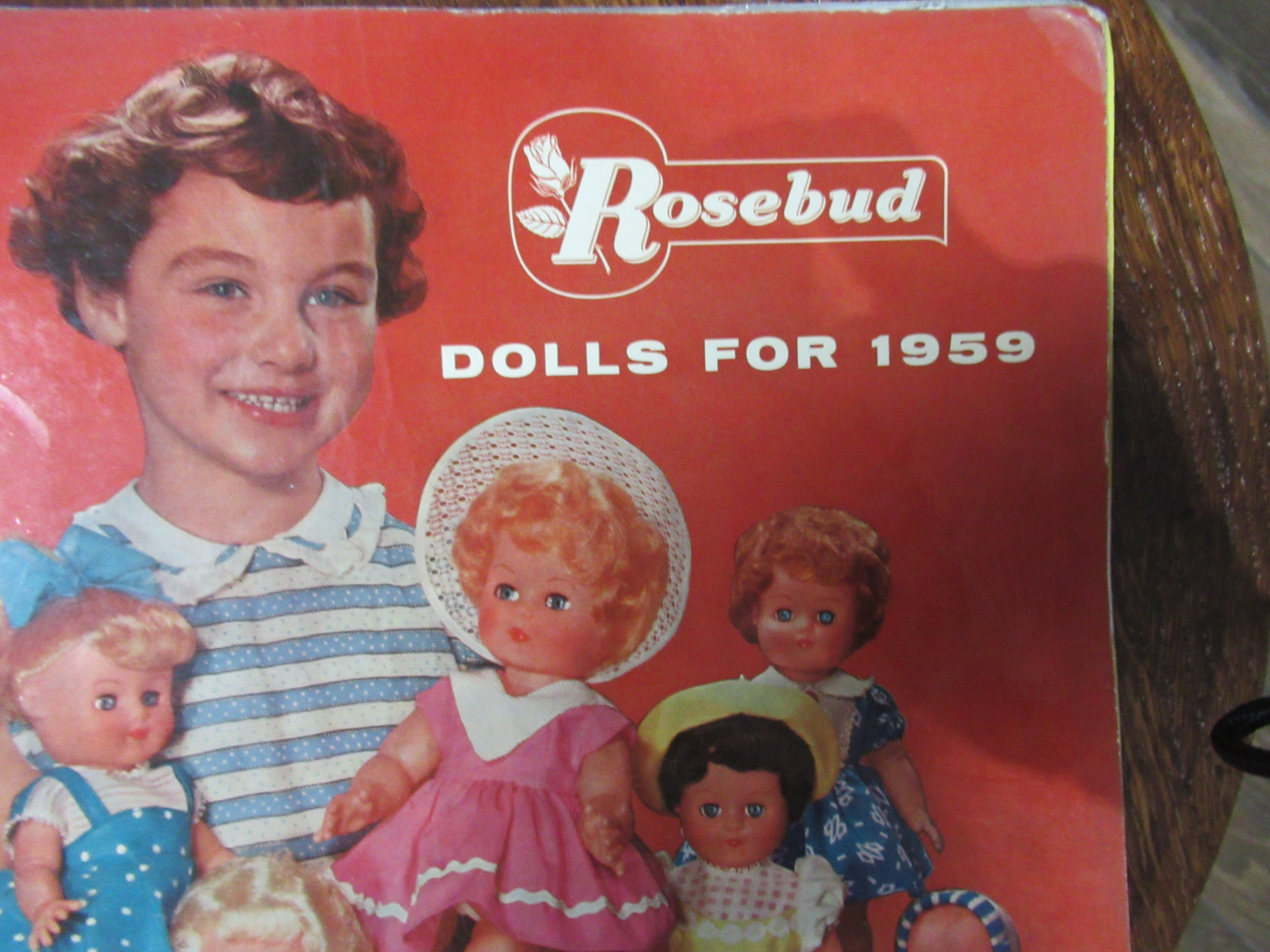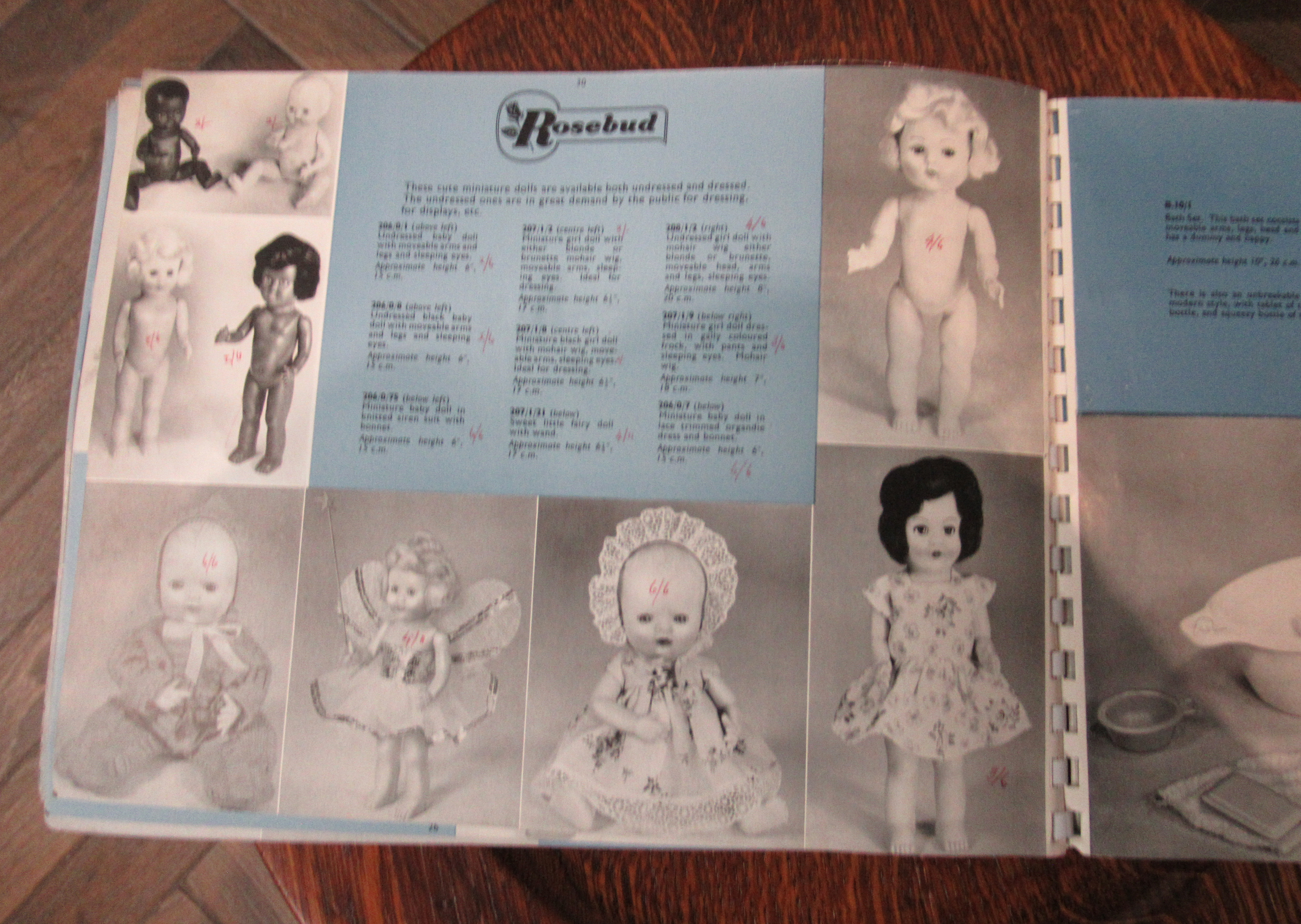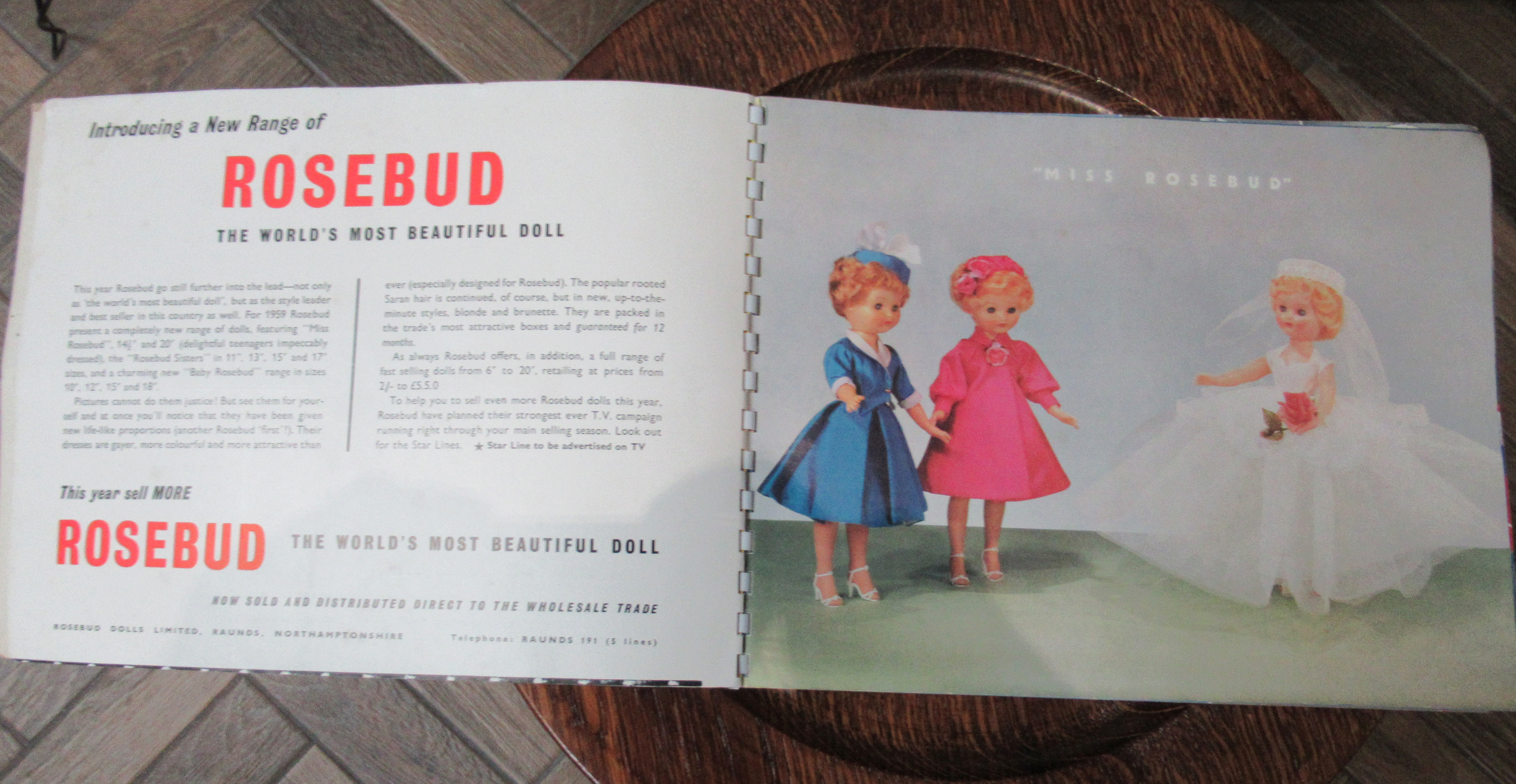This is an original Hard Back Rosebud Dolls Catalogue from 1959 – it would have been given to shopkeepers at the time to show customers what Rosebud dolls were available. It is in good used condition but has worn corners front and back and the back page has some cello covering coming away at the bottom left and also this back page has been creased in the past, the front cover page has also signs of creasing from the past. The Shopkeeper who was “M A Rapport & Co of Bridge Street Cardiff ” had this stamped on the inside cover and they also wrote prices and sizes through the catalogue in Biro ( this was common  practice ). This being said it is a wonderful bright example which I am only selling because I have found another. A lovely addition to a collection of 1950’s dolls. Measures 11 inch x 8 1/4 and also includes Rosebud Vinyl and teen dolls, along with squeaky toys.